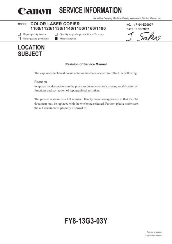 CANON CLC1100/1130/1150/1160/1180 REV.1 JAN. 2000 PRINTED IN JAPAN (IMPRIME AU JAPON)