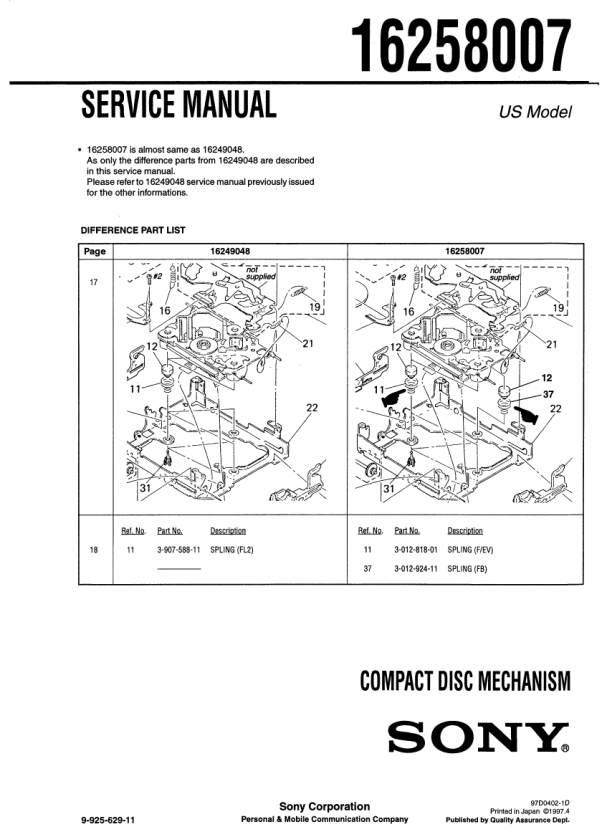 Strona główna >> SONY >> 16258007 Instrukcja Serwisowa