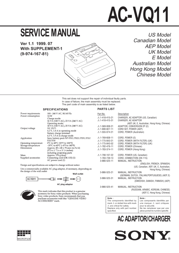 Part No. ! 1-418-415-21 ! 1-418-415-31 ! 1-569-008-21 ! 1-690-827-11 ! 1-555-074-21 ! 1-769-608-11 ! 1-775-843-21 ! 1-775-843-52 ! 1-782-476-11 ! 1-783-374-11 ! 1-790-107-22 1-783-739-13 3-866-525-11 Description CHARGER, AC ADAPTOR (US, Canadian) CHARGER, AC ADAPTOR (AEP, UK, E, Australian, Hong Kong, Chinese) ADAPTOR, CONVERSION 2P (E) CORD SET, POWER (AEP) CORD, POWER (Australian) CORD, POWER (E) CORD, POWER (WITH FILTER) (UK) CORD, POWER (WITH FILTER) (UK) CORD, POWER (Chinese) CORD, POWER (Hong Kong) CORD, POWER (US, Canadian) CORD, CONNECTION (DK-115) MANUAL, INSTRUCTION (ENGLISH, FRENCH, SPANISH) (US, Canadian, AEP, UK, E, Australian, Hong Kong, Chinese) MANUAL, INSTRUCTION (GERMAN, DUTCH, ITALIAN,PORTUGUESE) (AEP, E) MANUAL, INSTRUCTION (SWEDISH, DANISH, FINNISH) (AEP) MANUAL, INSTRUCTION (RUSSIAN, ARABIC, KOREAN, CHINESE) (AEP, E, Hong Kong, Chinese)