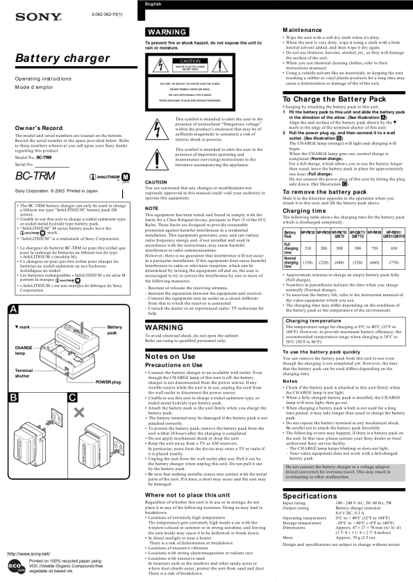 Sony Corporation © 2003 Printed in Japan �The BC-TRM battery charger can only be used to charge a lithium ion type �InfoLITHIUM� battery pack (M series). �Unable to use this unit to charge a nickel cadmium type, or nickel metal hydride type battery pack. ��InfoLITHIUM� M series battery packs have the mark. ��InfoLITHIUM� is a trademark of Sony Corporation. �Le chargeur de batterie BC-TRM ne peut être utilisé que pour la recharge de batteries au lithium-ion de type « InfoLITHIUM » (modèle M). �Ce chargeur ne peut pas être utilisé pour charger les batteries au nickel-cadmium ou aux hydrures métalliques de nickel. �Les batteries rechargeables « InfoLITHIUM » de série M portent la marque . �« InfoLITHIUM » est une marque de fabrique de Sony Corporation. You are cautioned that any changes or modifications not expressly approved in this manual could void your authority to operate this equipment.