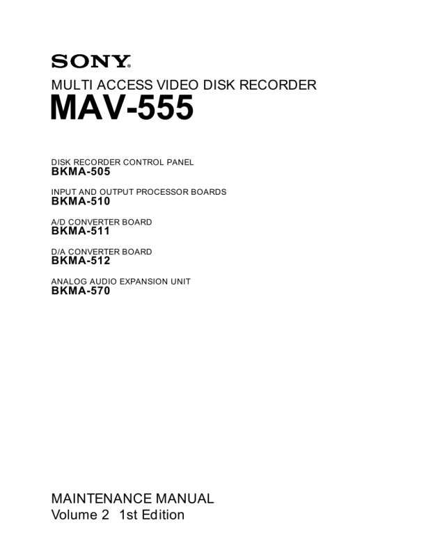 1-9-5 of the MAV-555 Installation Manual.) n The setting is not required in case of the 625-mode (PAL). 6. Turn off the main power and back on. Restart the MAV-555. n To restart the MAV-555 quickly, execute �027-FAST REBOOT� of the setup menu. 7. Press the R1 button on the PORT SELECT block of the meter panel. (Set so that the internal SG is output to the R1 port.) 8. Press the COMPOSITE button of the VIDEO INPUT SELECT block of the meter panel for at least three seconds. (The internal SG starts, and the COMPOSITE button and the SDI button are turned on.) 9. Press either the P1 or the P2 button of the PORT SELECT block of the meter panel in accordance with the port to which the BKMA-512 is connected. 10. Press the CONTROL button of the VIDEO PROCESS block on the meter panel several times, and enter the LOCAL mode. 11. Set all buttons of VIDEO, CHROMA, SETUP, and CHROMA PHASE on the meter panel to �PRESET�.