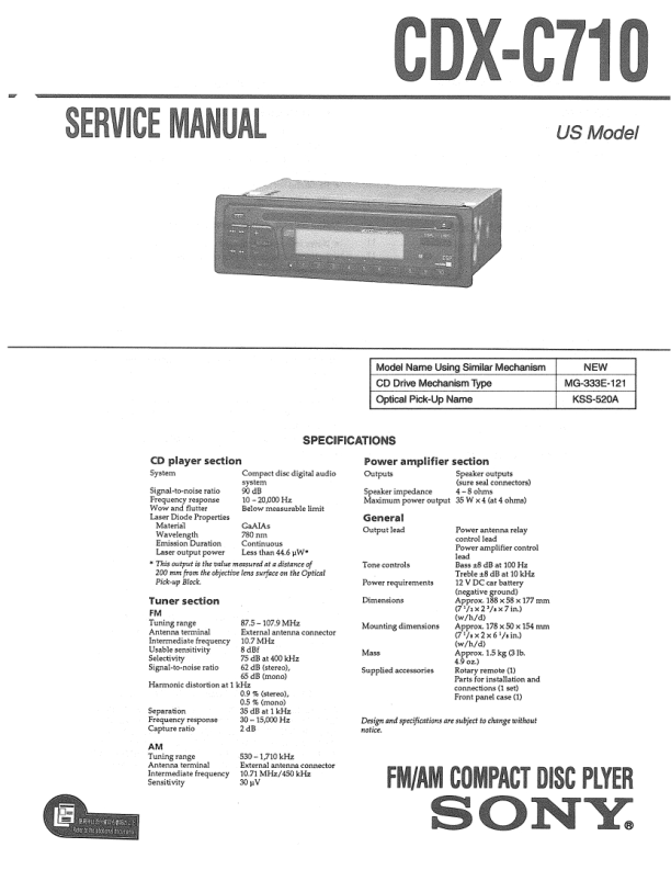 Opis SONY CDXC710 Instrukcja Serwisowa