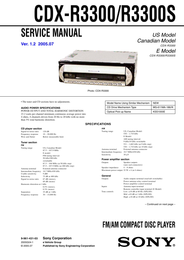 � Some CD-Rs/CD-RWs (depending on the equipment used for its recording or the condition of the disc) may not play on this unit. � You cannot play a CD-R/CD-RW that is not finalized�. � You can play MP3 files recorded on CD-ROMs, CD-Rs, and CD-RWs. � A CD-R/CD-RW to which a session can be added can be played. � A process necessary for a recorded CD-R/CD-RW disc to be played on the audio CD player. EXTENSION CABLE AND SERVICE POSITION When repairing or servicing this set, connect the jig (extension cable) as shown below. � Connect the MAIN board (CN751) and the SERVO board (CN2) with the extension cable (Part No. J-2502-076-1).