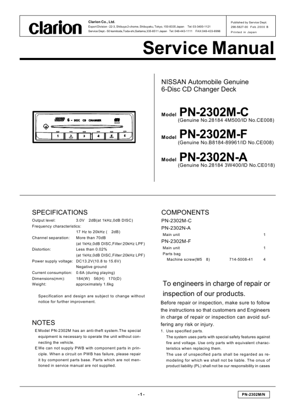 where an accident or failure is as a result of unspecified parts being used. Place the parts and wiring back in their original positions after replacement or re-wiring. For proper circuit construction, use of insulation tubes, bonding, gaps to PWB, etc, is involved. The wiring connection and routing to the PWB are specially planned using clamps to keep away from heated and high voltage parts. Ensure that they are placed back in their original positions after repair or inspection. If extended damage is caused due to negligence during repair, the legal responsibility shall be with the repairing company. Check for safety after repair. Check that the screws, parts and wires are put back securely in their original position after repair. Ensure for safety reasons there is no possibility of secondary ploblems around the repaired spots. If extended damage is caused due to negligence of repair, the legal responsibility shall be with the repairing company. Caution in removal and making wiring connection to the parts for the automobile. Disconnect the battery terminal after turning the ignition key off. If wrong wiring connections are made with the battery connected, a short circuit and/or fire may occur. If extensive damage is caused due to negligence of repair, the legal responsibility shall be with the repairing company. Cautions regarding chips. Do not reuse removed chips even when no abnormality is observed in their appearance. Always replace them with new ones. (The chip parts include resistors, capacitors, diodes, transistors, etc). The negative pole of tantalum capacitors is highly susceptible to heat, so use special care when replacing them and check the operation afterwards.