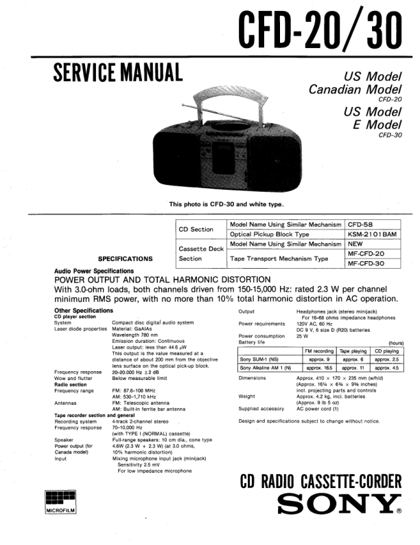 Opis SONY CFD-20 Instrukcja Serwisowa