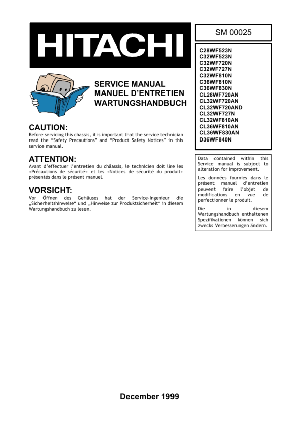 Bevor die Grundplatte gewartet wird, sollte ein Trenntrafo zwischen die Netzleitung und das Produkt eingebracht werden. 1. Wenn die Grundplatte in das Gehäuse zurückgestellt wird, stellen Sie sicher, dass alle Schutzvorrichtungen wieder an ihrem Ort sind. 2. Wenn Wartung erforderlich ist, halten Sie die originale Verdrahtungsart ein. Besondere Vorsicht ist nötig, um die korrekte Verdrahtungsart in jedem Hochspannungsstromkreis zu gewährleisten. Viele elektrische und mechanische Teile von HITACHI Produkten haben besondere sicherheitsbezogene Eigenschaften. Diese Eigenschaften fallen oft nicht ins Auge, aber der durch sie gewährte Schutz kann nicht unbedingt erreicht werden, wenn man Ersatzteile benutzt, die für höhere Spannung, Leistung usw. ausgelegt sind. Ersatzteile, die diese besonderen Sicherheitsmerkmale haben, sind in den Prinzipskizzen und Ersatzteillisten an einem ! zu erkennen. Der Gebrauch von Ersatzteilen, die nicht dieselben Sicherheitsmerkmale haben wie die empfohlenen HITACHI Ersatzteile, wie sie in der Ersatzteilliste aufgeführt sind, kann zu elektrischem Schlag, Feuer, Röntgenstrahlung und anderen Gefahren führen. 4. Immer die originalen Abstandsstücke ersetzen und die Leitungslängen beibehalten. Wo ein Kurzschluss passiert ist, die Teile ersetzen, bei denen �berhitzung nachzuweisen ist. Der Isolierwert sollte bei 500 V Gleichstrom zwischen den Hauptpolen und allen zugänglichen Metallteilen nicht unter 2M Ohm liegen. Bei der Prüfung auf Durchschlagsfestigkeit sollte kein �berschlag oder Durchschlag vorkommen, wenn zwei Sekunden lang 3 kV Wechselstrom oder 4,25 kV Gleichstrom zwischen den Hauptpolen und allen zugänglichen Metallteilen angelegt wird.