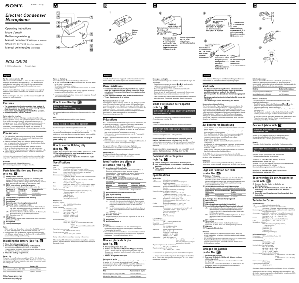 L�alimentazione viene fornita al microfono dall�apparecchio collegato. In tal caso, la funzione di riduzione dei disturbi non è disponibile. Se não for manuseada com cuidado, a pilha pode explodir. Não recarregue, não desmonte nem queime a pilha.
