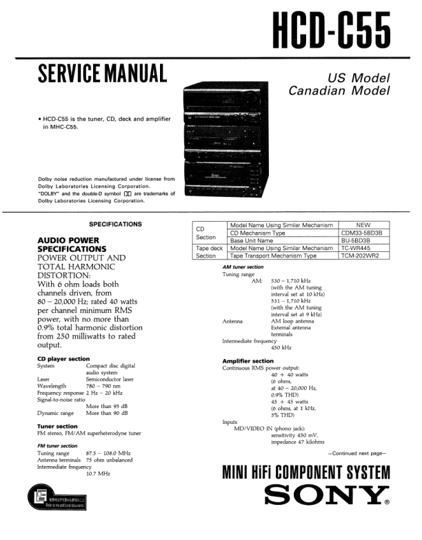 Opis SONY HCD-C55 Instrukcja Serwisowa