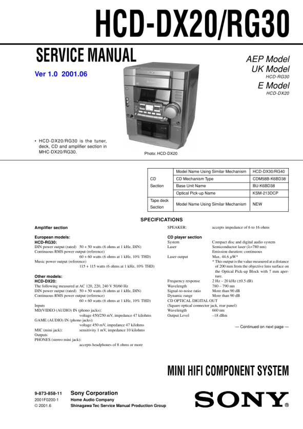 [MC Test Mode] � This mode is used to check operations of the respective sections of Amplifier, TUNER, CD and Tape. Procedure: 1. Press the ?/1 button to turn on the set. 2. Press the three buttons of x , ENTER and DISC 3 simultaneously. 3. A message �TEST MODE� appears on the FL display tube. � The messages VACS1 to VACS5 are displayed when the VACS is changed in this mode. � The number of repeats of TAPE and CD is set to the infinite number as the default setting. 4 When v (CURSOR UP) button is pressed, GEQ increases to its maximum and a message �GEQ MAX� appears. 5. When V (CURSOR DOWN) button is pressed, GEQ decreases to its minimum and a message �GEQ MIN� appears. 6. When b (CURSOR LEFT) or B (CURSOR RIGHT) button is pressed, GEQ is set to flat and a message �GEQ FLAT� appears. 7. In the test mode, the default-preset channel is called even when the TUNER is selected and an attempt is made to call the preset channel that has been stored in memory, by operating the Shuttle knob. (It means that the memory is cleared.) 8. When a tape is inserted in the Deck B and the TAPE B function is selected, and when the REC PAUSE/START button is pressed twice, recording starts. The VIDEO function is selected automatically as the input source. 9. Select the desired loop by pressing the PLAY MODE button in the TAPE B function. Insert a test tape AMS-110A or AMSRO to Deck A. 10. Press the SPECTRUM button to enter the AMS test mode. 11. After a tape is rewound first, the FF AMS is checked, and the mechanism is shut off after detecting the AMS signal twice. 12. Then the REW AMS is checked and the mechanism is shut off after detecting the AMS signal twice. 13. When the check is complete, a message of either OK or NG appears. 14. When the two buttons of SPECTRUM and DISC1 are pressed at the same time in any function modes, either the �VACS ON� display to enable the VACS function or the �VACS OFF� display to disable the VACS function can be selected. 15. When you want to exit this mode, press the ?/1 button twice. The cold reset is enforced at the same time.
