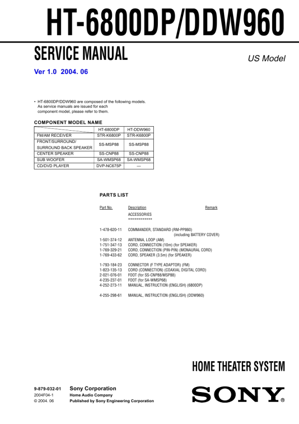 Part No. Description ACCESSORIES ************ 1-478-620-11 1-501-374-12 1-751-347-13 1-769-329-21 1-769-433-62 1-793-184-23 1-823-135-13 2-021-076-01 4-235-237-01 4-252-273-11 4-255-298-61 COMMANDER, STANDARD (RM-PP860) (including BATTERY COVER) ANTENNA, LOOP (AM) CORD, CONNECTION (10m) (for SPEAKER) CORD, CONNECTION (PIN-PIN) (MONAURAL CORD) CORD, SPEAKER (3.5m) (for SPEAKER) CONNECTOR (F TYPE ADAPTOR) (FM) CORD (CONNECTION) (COAXIAL DIGITAL CORD) FOOT (for SS-CNP88/MSP88) FOOT (for SA-WMSP68) MANUAL, INSTRUCTION (ENGLISH) (6800DP) MANUAL, INSTRUCTION (ENGLISH) (DDW960) Remark