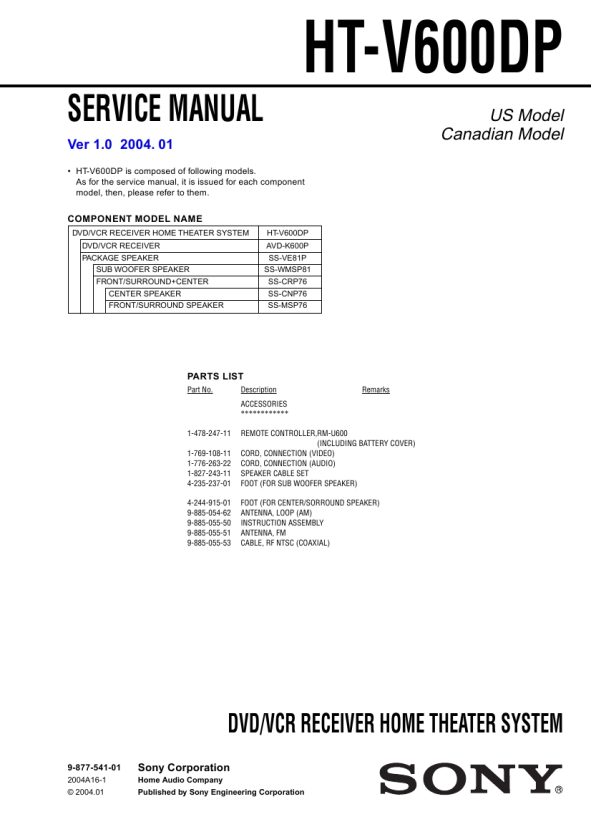Part No. Description ACCESSORIES ************ 1-478-247-11 1-769-108-11 1-776-263-22 1-827-243-11 4-235-237-01 4-244-915-01 9-885-054-62 9-885-055-50 9-885-055-51 9-885-055-53 REMOTE CONTROLLER,RM-U600 (INCLUDING BATTERY COVER) CORD, CONNECTION (VIDEO) CORD, CONNECTION (AUDIO) SPEAKER CABLE SET FOOT (FOR SUB WOOFER SPEAKER) FOOT (FOR CENTER/SORROUND SPEAKER) ANTENNA, LOOP (AM) INSTRUCTION ASSEMBLY ANTENNA, FM CABLE, RF NTSC (COAXIAL) Remarks