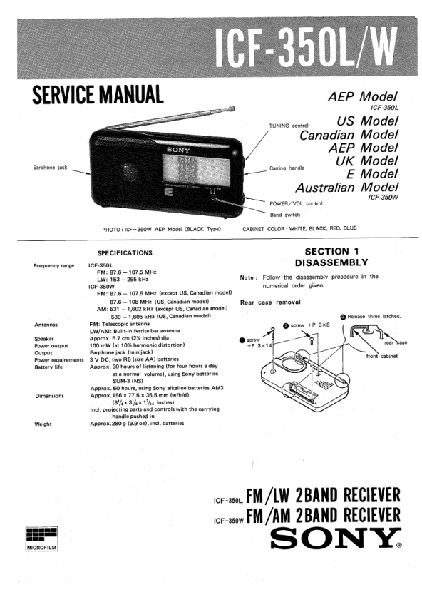 Opis SONY ICF350L/W Instrukcja Serwisowa