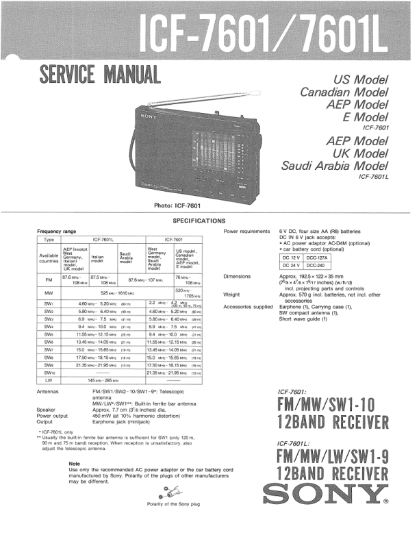 Opis SONY ICF7601 Instrukcja Serwisowa