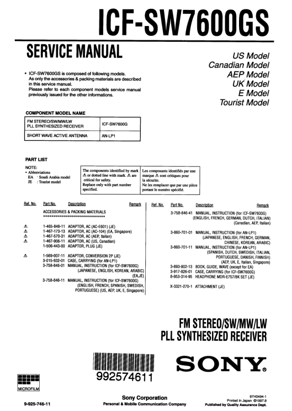 Opis SONY ICFSW7600GS Instrukcja Serwisowa