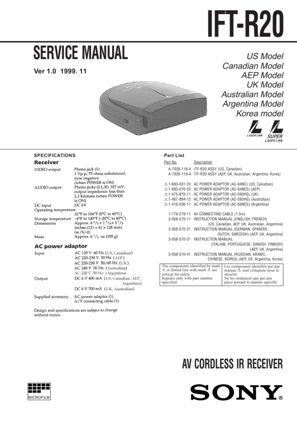 Part No. Description A-7028-118-A ITF-R20 ASSY (US, Canadian) A-7028-119-A ITF-R20 ASSY (AEP, UK, Australian, Argentina, Korea) 0 1-693-031-24 0 1-693-070-33 0 1-475-870-11 0 1-467-894-12 0 1-418-036-11 AC POWER ADAPTOR (AC-64NC) (US, Canadian) AC POWER ADAPTOR (AC-64NES) (AEP) AC POWER ADAPTOR (AC-E60HG) (UK) AC POWER ADAPTOR (AC-E60HG) (Australian) AC POWER ADAPTOR (AC-64NES) (Argentina)