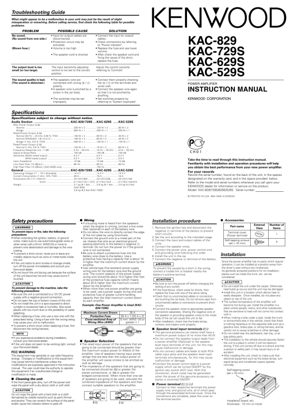 25W or greater KAC-629S ! KAC-829 Power indicator KAC-729S KAC-629S KAC-529S