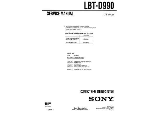 Strona główna >> SONY >> LBTD990 Instrukcja Serwisowa