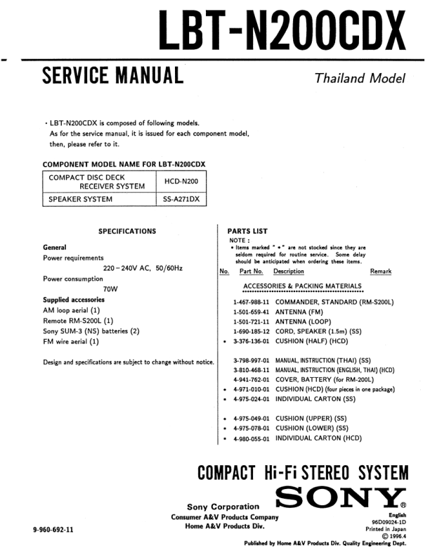 Opis SONY LBT-N200CDX Instrukcja Serwisowa