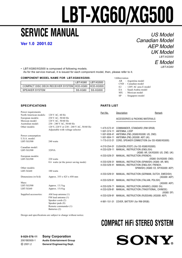 LBT-XG60 SPEAKER SYSTEM SS-XG60 LBT-XG500 SS-XG500 COMPACT DISC DECK RECEIVER SYSTEM HCD-XG60 HCD-XG500 �Abbreviation AR : Argentina model CND : Canadian model E2 : 120V AC area E model EA : Saudi Arabia model MX : Mexican model SP : Singapore model
