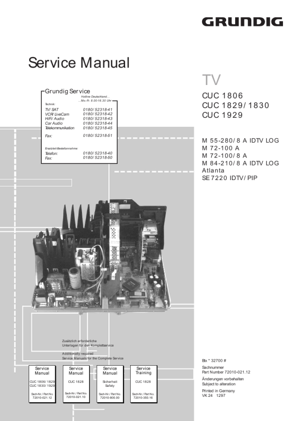 MOUNTING ACCESSORIES F.CRT NO SPARE PART COIL CLAMP DEGAUSING COIL PICT.TUBE A68ESF202X43/ A68ES ANODE CAP W.HIGH VOLTAGE KABLE KEYBOARD NO SPARE PART SOCKET BOARD NO SPARE PART CINCH SOCKET 3 FOLD YE/WH/RD HEADPHONE SOCKET 3,5 W/O SWITCH 1.1 POWER SWITCH BOARD NO SPARE PART POWER SWITCH ECO W/O WIPER FUSE HOLDER COVER CHASSIS KEY SWITCH PROGRAMME + KEY SWITCH PROGRAMME KEY SWITCH VOLUME + KEY SWITCH VOLUME KEY LIGHT GUIDE CPL KEY SET POWER CABLE CPL GWN9.22 REMOTE CONTROL TP 800 PICTURE TUBE BOARD OPERATING INSTRUCTIONS 01.75 OPERATING INSTRUCTIONS 02.75 SERVICE MANUAL D/GB SERVICE MANUAL D/GB 2ND SUPPLEMENT CHASSIS TV STEREO 01.75 CUC 1830 NO SPARE PART CHASSIS TV STEREO 02.75 CUC 1830 NO SPARE PART X = SEE SEPARATE PARTS LIST 29602-603.51 1 29635-204.01