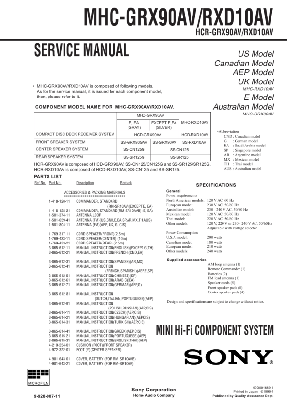 HCD-GRX90AV SS-GRX90GAV SS-CN125G SS-SR125G SS-GRX90AV