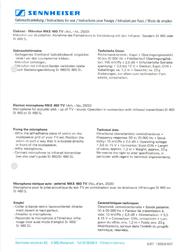 Strona główna >> SENNHEISER >> MKE 460 TV Instrukcja Obsługi