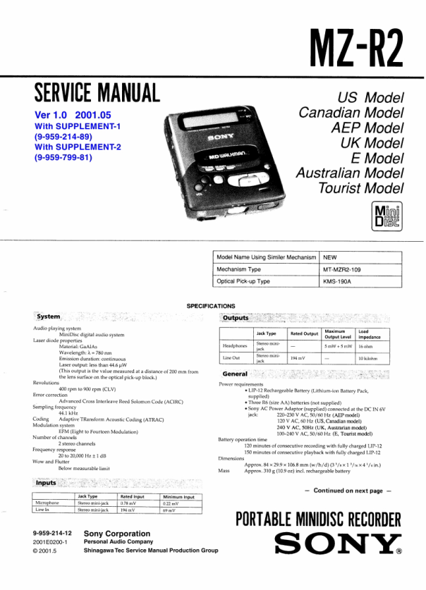 Personal Audio Company Shinagawa Tec Service Manual Production Group