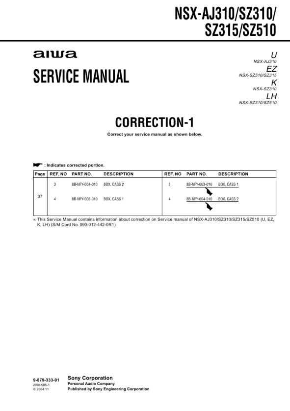 � This Service Manual contains information about correction on Service manual of NSX-AJ310/SZ310/SZ315/SZ510 (U, EZ, K, LH) (S/M Cord No. 090-012-442-0R1).