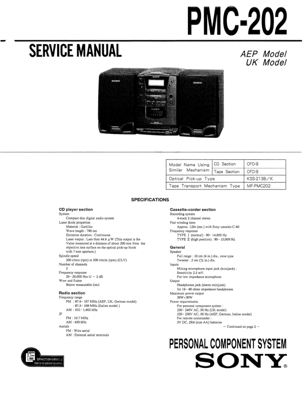 Note: � All capacitors are in µF unless otherwise noted. pF: µµF 50 WV or less are not indicated except for electrolytics and tantalums. � All resistors are in � and 1/4 W or less unless otherwise specified. � ¢ : internal component. Note: The components identified by mark ! or dotted line with mark ! are critical for safety. Replace only with part number specified. � � � � U : B+ Line. V : B� Line. H : adjustment for repair. Voltages and waveforms are dc with respect to ground under no-signal (detuned) conditions. no mark : FM ( ) : TAPE PLAY < > : TAPE REC (( )) : CD � : Impossible to measure Voltages are taken with a VOM (Input impedance 10 M�). Voltage variations may be noted due to normal production tolerances. Waveforms are taken with a oscilloscope. Voltage variations may be noted due to normal production tolerances. Circled numbers refer to waveforms. Signal path. F : FM f : AM E : PB a : REC J : CD
