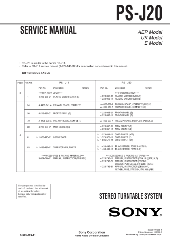 � PS-J20 is similar to the earlier PS-J11. � Refer to PS-J11 service manual (9-922-948-XX) for imformation not contained in this manual.
