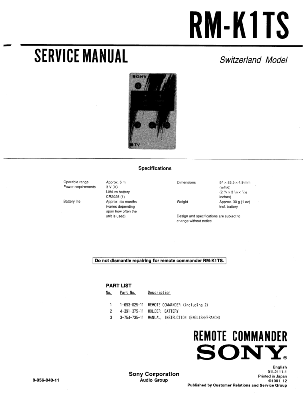 Opis SONY RMK1TS Instrukcja Serwisowa