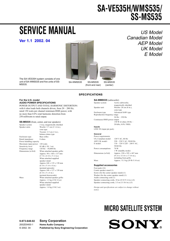 For the U.S. model AUDIO POWER SPECIFICATIONS POWER OUTPUT AND TOTAL HARMONIC DISTORTION: with 6 ohm loads both channels driven, from 20 � 200 Hz; rated 150 watts per channel minimum RMS power, with no more than 0.8% total harmonic distortion from 250 milliwatts to rated output. SS-MS535 (front, center, and rear speakers)