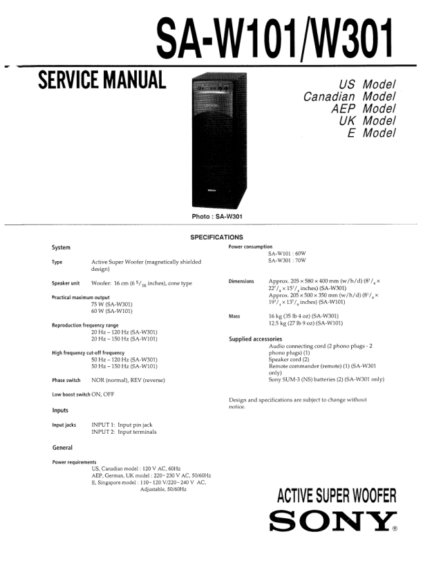 Opis SONY SA-W101 Instrukcja Serwisowa