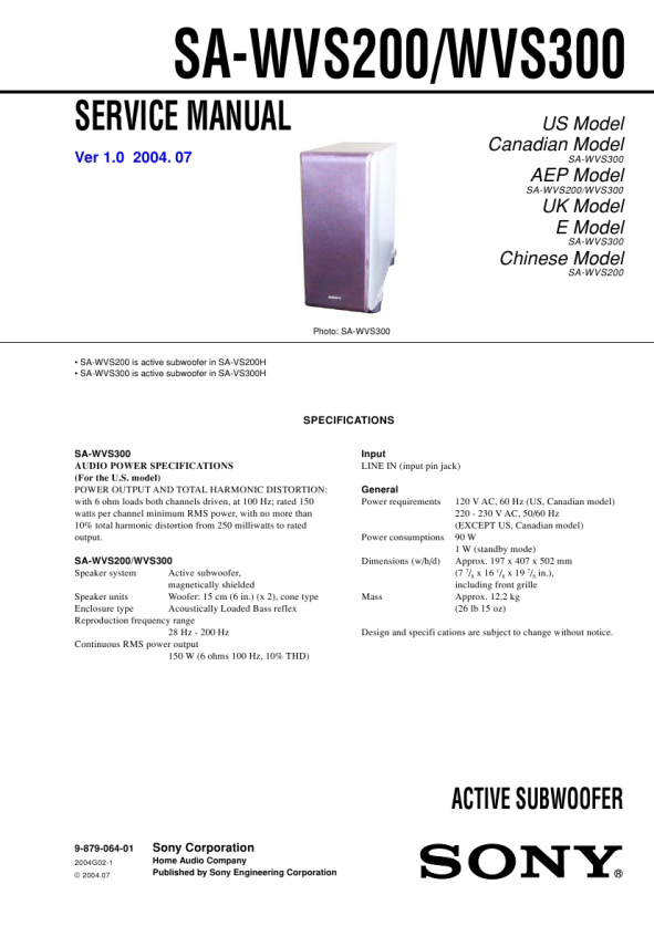 SA-WVS300 AUDIO POWER SPECIFICATIONS (For the U.S. model) POWER OUTPUT AND TOTAL HARMONIC DISTORTION: with 6 ohm loads both channels driven, at 100 Hz; rated 150 watts per channel minimum RMS power, with no more than 10% total harmonic distortion from 250 milliwatts to rated output. SA-WVS200/WVS300 Speaker system Active subwoofer, magnetically shielded Speaker units Woofer: 15 cm (6 in.) (x 2), cone type Enclosure type Acoustically Loaded Bass reflex Reproduction frequency range 28 Hz - 200 Hz Continuous RMS power output 150 W (6 ohms 100 Hz, 10% THD) Input LINE IN (input pin jack) General Power requirements