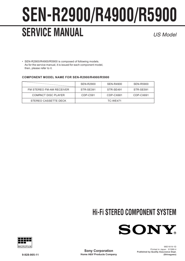 � SEN-R2900/R4900/R5900 is composed of following models. As for the service manual, it is issued for each component model, then, please refer to it.