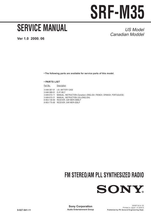 Part No. 3-048-387-01 3-048-389-01 3-049-015-11 3-049-015-21 8-953-130-90 8-953-775-90 Description LID, BATTERY CASE CLIP, BELT MANUAL, INSTRUCTION (Canadian) (ENGLISH, FRENCH, SPANISH, PORTUGUESE) MANUAL, INSTRUCTION (US) (ENGLISH) RECEIVER, EAR MDR-E806LP RECEIVER, EAR MDR-026LP