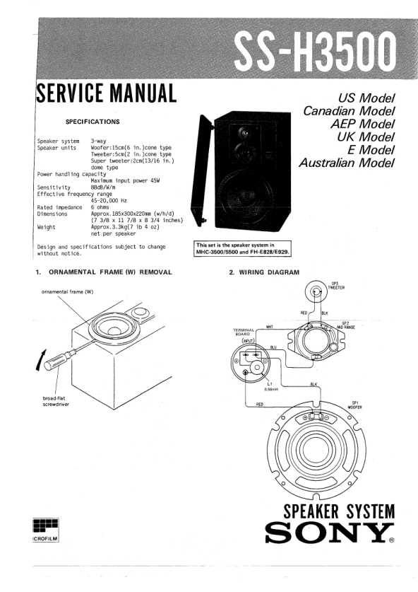 Opis SONY SSH3500 Instrukcja Serwisowa