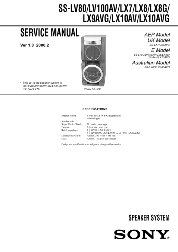 Speaker system Speaker units Super Woofer/Woofer: Tweeter: Rated impedance Dimensions (w/h/d) Mass 3-way BUILT IN SW, magnetically shielded type 20 cm dia., cone type 2.5 cm dia., horn type 4 � (LV80, LX8, LX8G) 6 � (LV100AV, LX7, LX9AVG, LV10AV, LX10AVG) Approx. 290 � 615 � 435 mm Approx. 16 kg net per speaker