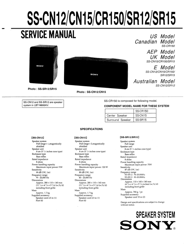 Opis SONY SS-SR15 Instrukcja Serwisowa