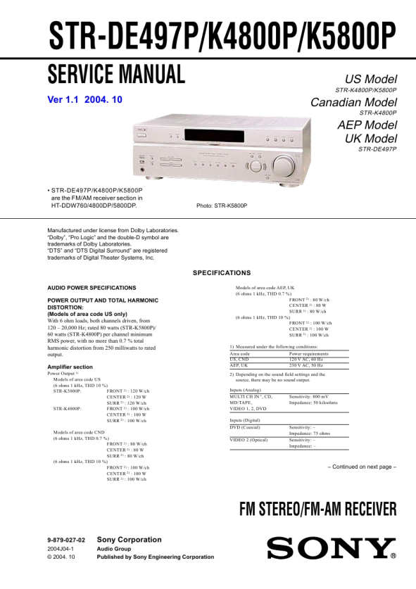 * Button check * Procedure: While depressing the [TUNER FM/AM] and the [A.F.D.] buttons simultaneously, press the ?/1 button to turn on the main power. Either the message �REST 26� (STR-DE497P) or �REST 25� (STR-K4800P/K5800P) appears. Every pressing of any button other than the ?/1 counts down the buttons. The buttons which are already counted once are not counted again. When all buttons are pressed �REST 00� appears.