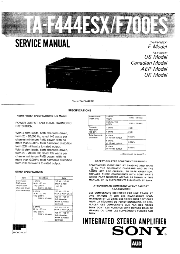 Opis SONY TAF700ES Instrukcja Serwisowa