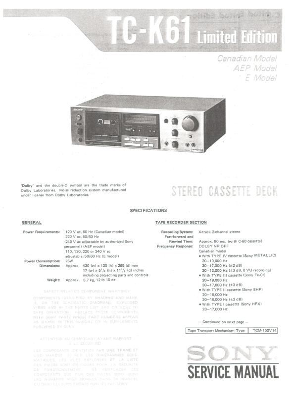 Opis SONY TC-K61 Instrukcja Serwisowa