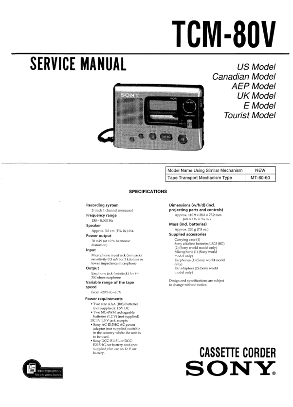 Opis SONY TCM-80V Instrukcja Serwisowa