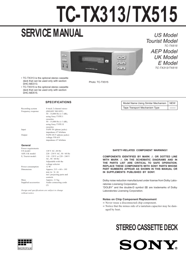 1. The adjustment should be performed in the publication. (Be sure to male playback adjustment at first.) 2. The adjustments and measurement should be performed for both L-CH and R-CH. � Switch position DOLBY NR switch : OFF DIRECTION switch : A Standard Input Level Input terminal source impedance input signal level Standard Output Level Output terminal load impedance output signal level Test Tape Type P-4-A100 P-4-L300 WS-48A Signal 10 kHz, �10 dB 315 Hz, 0 dB 3 kHz, 0 dB Used for Azimuth Adjustment PB Level Adjustment Tape Speed Adjustment TAPE OUT (L-CH) 47 k� 0.49 V (� 4 dB) TAPE IN 10 k� 0.49 V (� 4 dB)