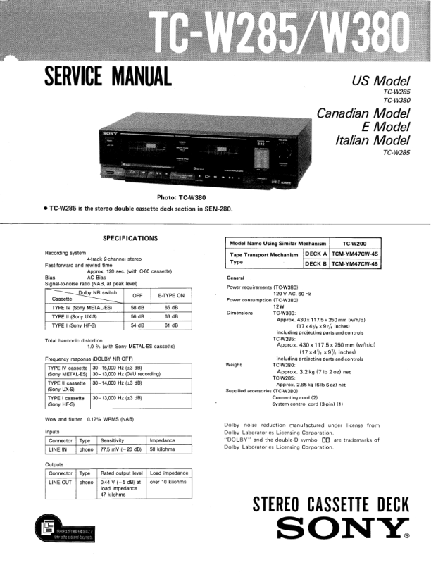 Opis SONY TCW285 Instrukcja Serwisowa