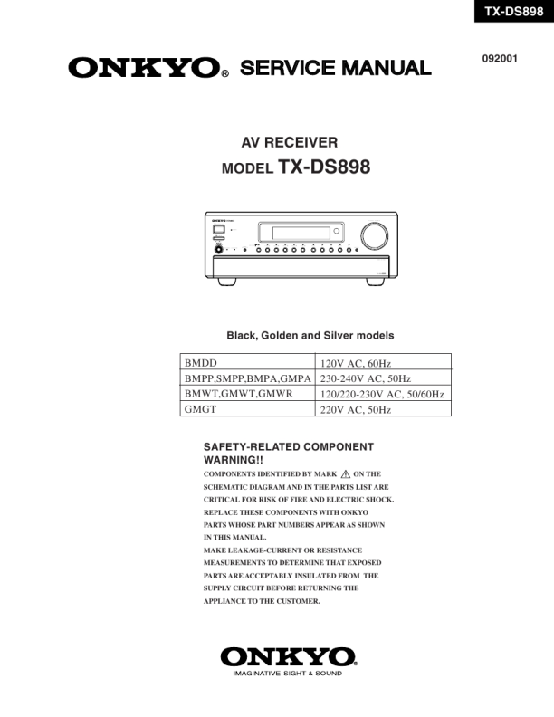 Confirmation of protection circuit 1. Confirmation of operation of speaker relay Confirm that the speaker relays turn ON approximate. 5 seconds after the power switch is turned ON. Confirm that the speaker relays turn OFF immediately after the power switch is turned OFF. 2. Confirmation of DC detection circuit Press and hold down CD button, then press STANDBY/ON and DISPLAY buttons to set the unit to "TEST-1" mode. After "TEST-1" on the FL tube light on, press VIDEO 1 button to set the unit to "TEST-1-00". Apply DC 1.5 to 3V to MULTI CHANNEL INPUT terminal with no load. Confirm that the speaker relay turns OFF. Apply DC -1.5 to -3V to MULTI CHANNEL INPUT terminal with no load. Confirm that the speaker relay turns OFF. Caution: Don't apply DC voltage more than 1 sec..
