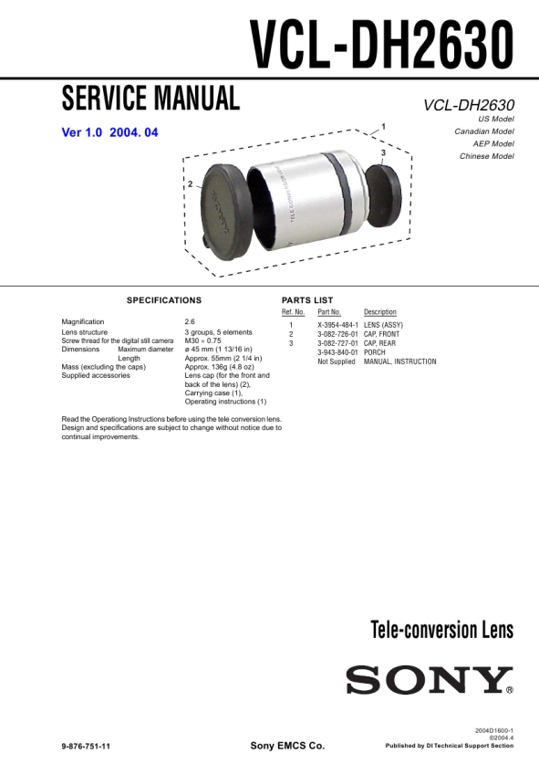 Ref. No. 1 2 3 Part No. X-3954-484-1 3-082-726-01 3-082-727-01 3-943-840-01 Not Supplied Description LENS (ASSY) CAP, FRONT CAP, REAR PORCH MANUAL, INSTRUCTION