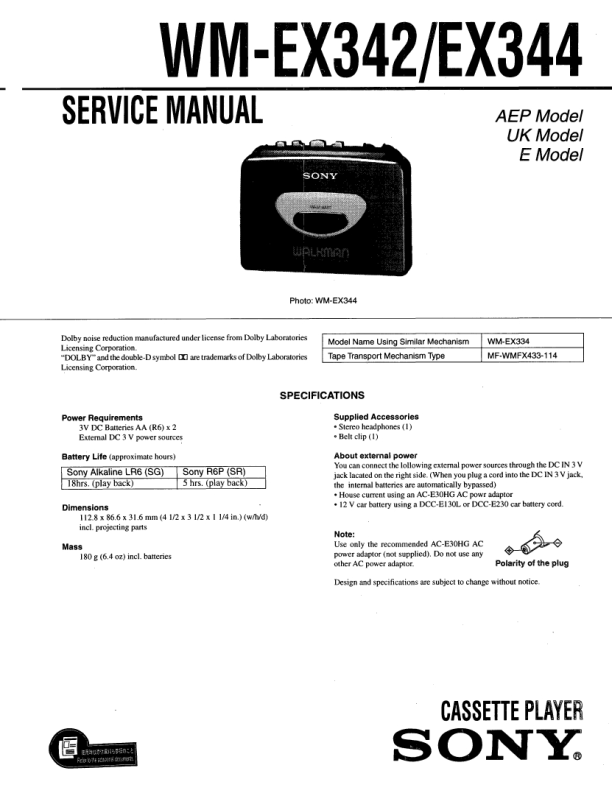 Opis SONY WM-EX344 Instrukcja Serwisowa