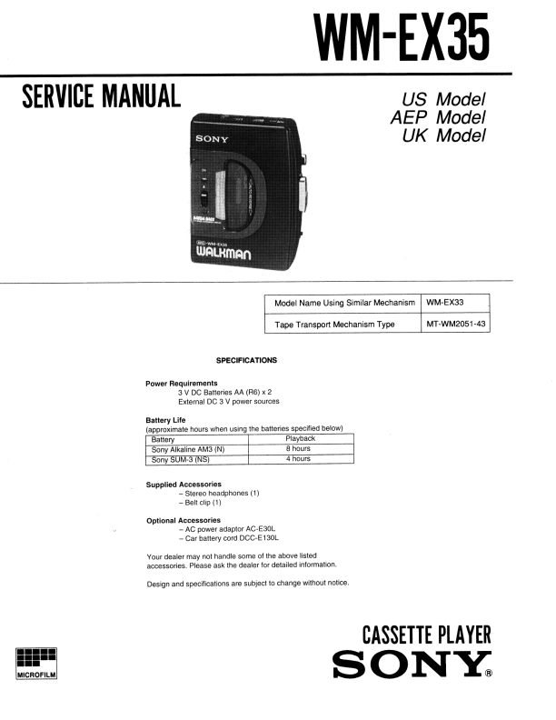 Opis SONY WM-EX35 Instrukcja Serwisowa