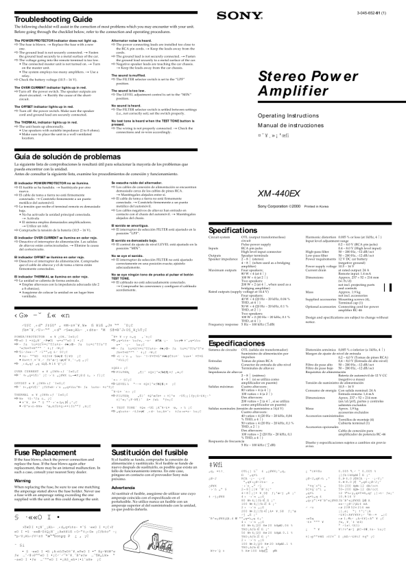 �1 Protection circuit This amplifier is provided with a protection circuit that activates in the following cases: � when the unit is overheated � when a DC current is generated � when the speaker terminals are short-circuited. The color of the POWER/PROTECTOR indicator will change from green to red, and the unit will shut down. If this happens, turn off the connected equipment, take out the cassette tape or disc, and determine the cause of the malfunction. If the amplifier has overheated, wait until the unit cools down before using again. �2 Pulse power supply This unit has a built-in power regulator which converts the power supplied by the DC 12 V car battery into high speed pulses using a semiconductor switch. These pulses are stepped up by the built-in pulse transformer and separated into both positive and negative power supplies before being converted into direct current again. This is to regulate fluctuating voltage from the car battery. This light weight power supply system provides a highly efficient power supply with a low impedance output.